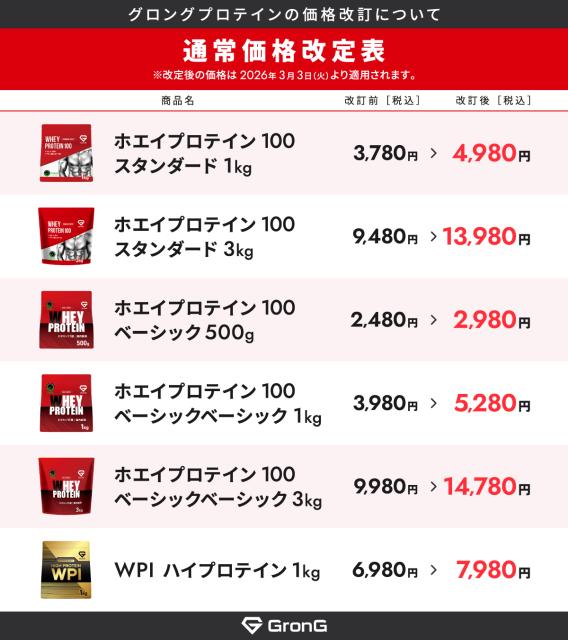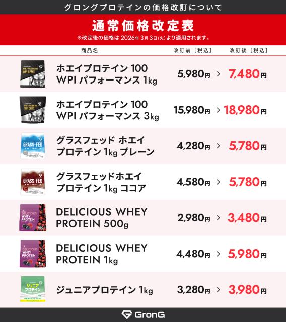 2026年3月3日(火)に「GronGホエイプロテイン」各種シリーズの価格改定を行います。