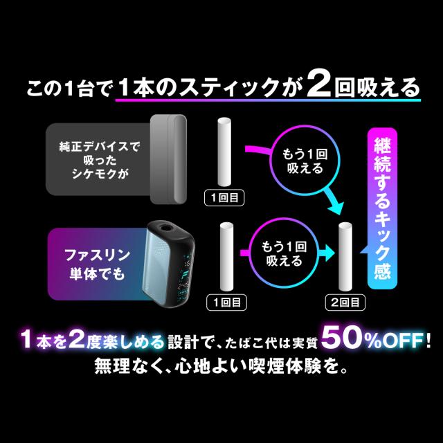 | 自動吸引システム採用、自動出力調整機能搭載で、本体を操作するボタンなどは一切ない。直観的操作を極めた、簡単シンプル設計の小型スティックPODが登場。大容量バッテリーに急速充電対応、バッテリー残量表示もあり、あると嬉しい機能をコンパクトボディに詰め込んだ「こういうのでいいんだよ」を体現する、常用必須デバイスです。 |