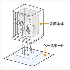 ベースボートは鋼板仕上げで、金庫の側面より大きい形状で底敷き固定します。万一、床から剥がれても「持ちにくいバランスと形状」「出入口からは安易に持ち出しにくいサイズ」で犯人に時間と手間を取らせます。設置場所に合わせ右寄せ・左寄せにも対応可能。防犯対策に大きく効果を発揮します。