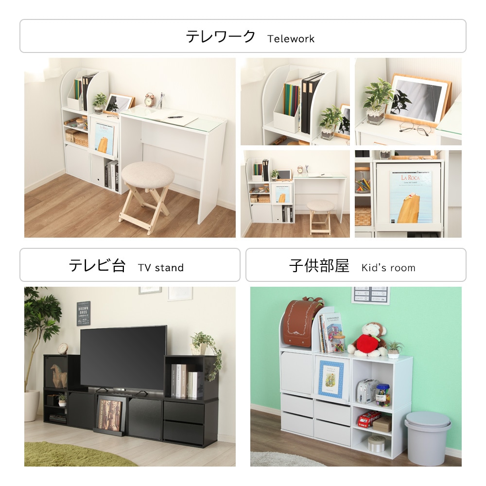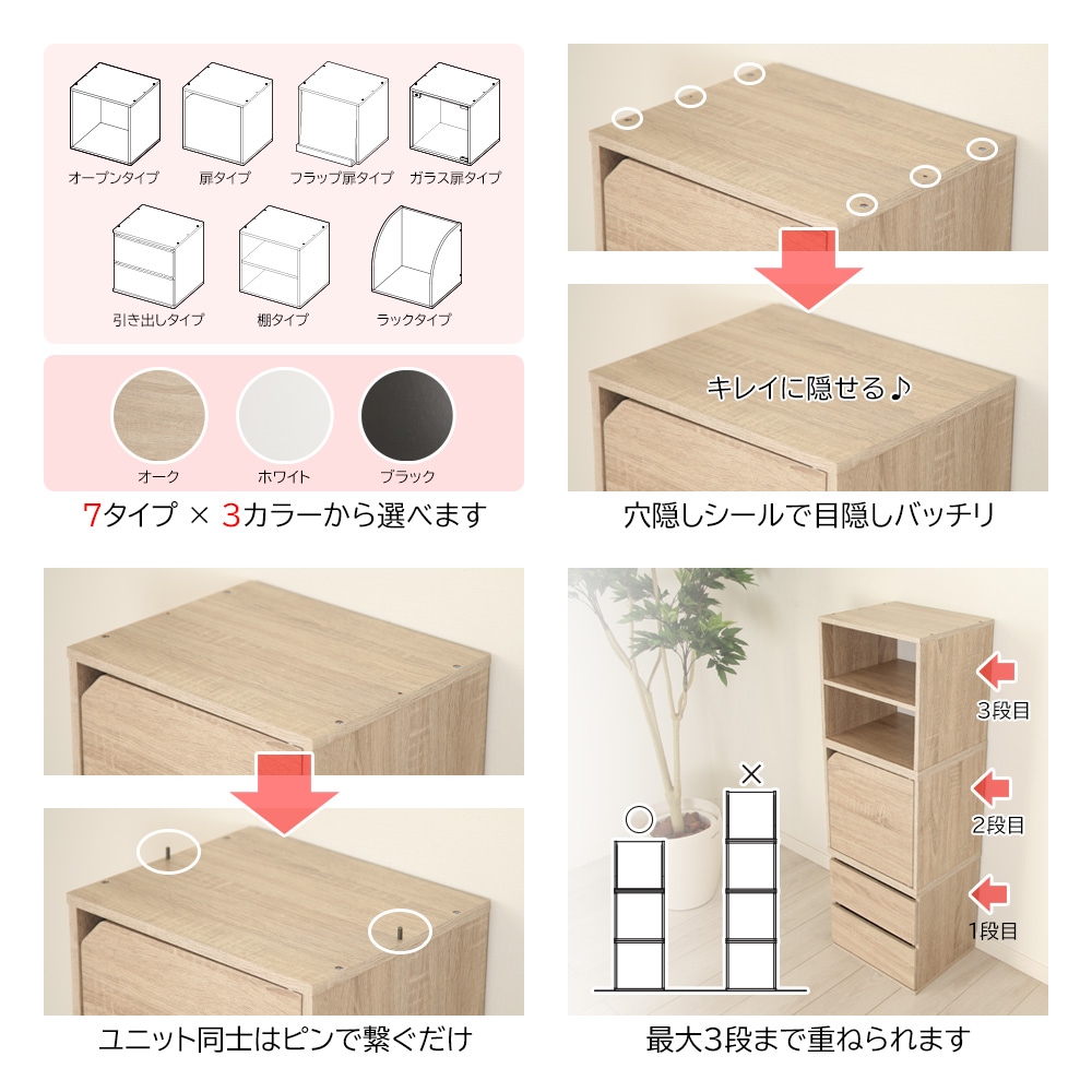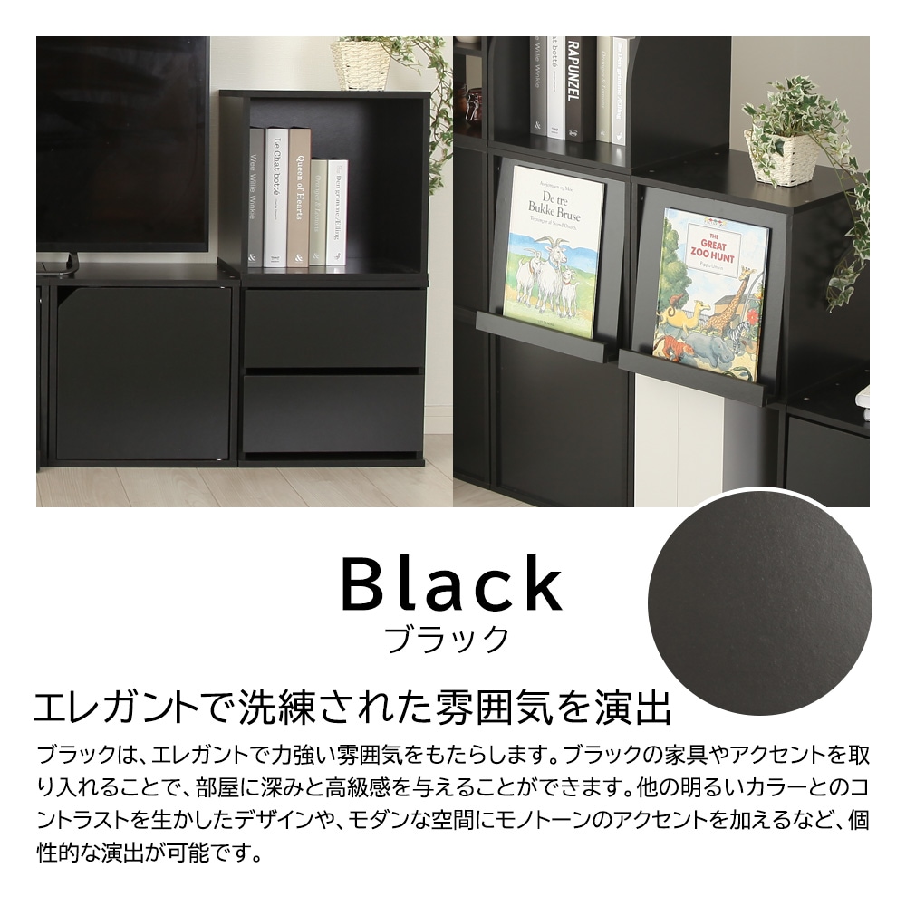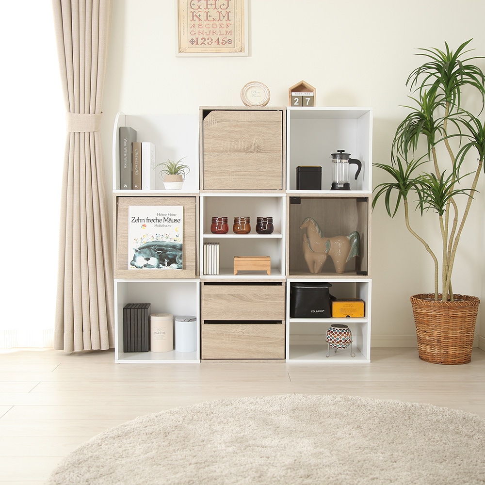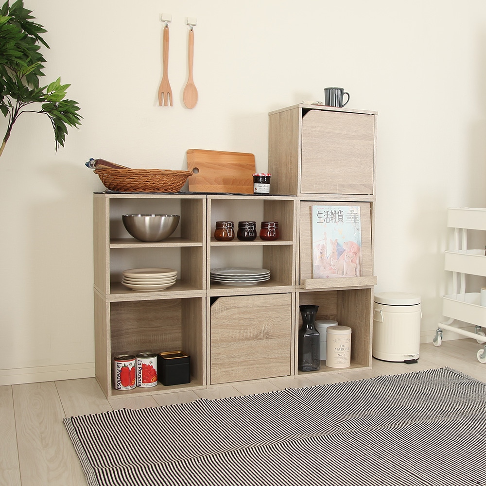 「組み合わせキューブボックス キューブリック」は、7つの異なるタイプ(オープン、引き出し、木製扉、ガラス扉、フラップ扉、棚、ラック)から選ぶことができます。オーク、ホワイト、ブラックと3つのカラーを用意致しました。キューブリックは、インテリアに合わせて使いやすく、収納やディスプレイに最適なアイテムです。機能とスタイルを兼ね備えた木製ラックで、お部屋の空間を美しく整えることができます。