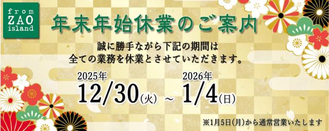 12月30日〜1月4日の間は受注・返信・発送業務のお休みをいただき、年始は1月5日から営業いたします。