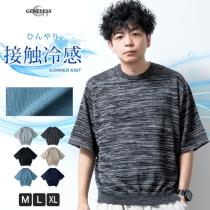 ニット メンズ 接触冷感 半袖 サマーニット ひんやり トップス ストレッチ 5分袖 オーバーサイズ メンズニット ネイビー 春夏 全6色 JP24