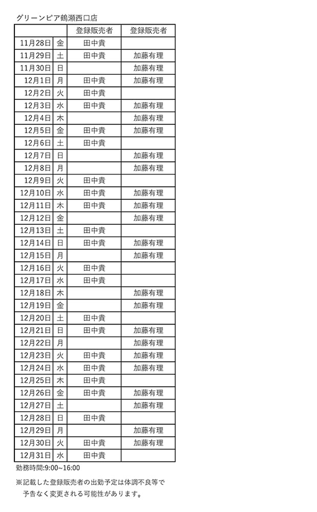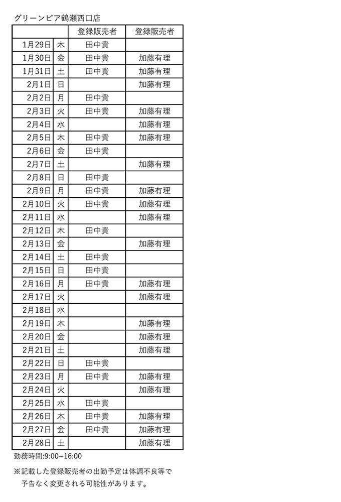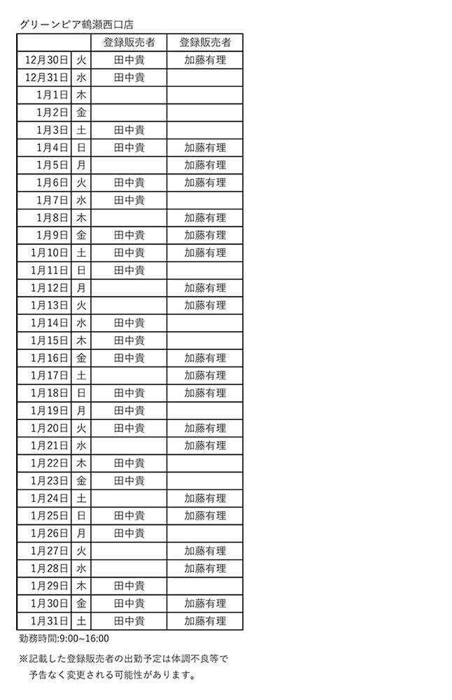 グリーンピア鶴瀬西口店舗勤務シフト一覧
