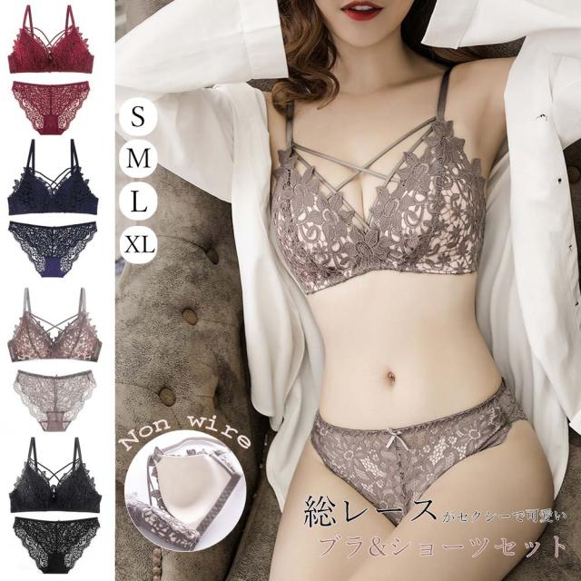 【メール便 送料無料】ブラジャー ショーツ セット レディース 美胸 セクシーランジェリー 谷間 ブラジャー ノンワイヤー 総レース