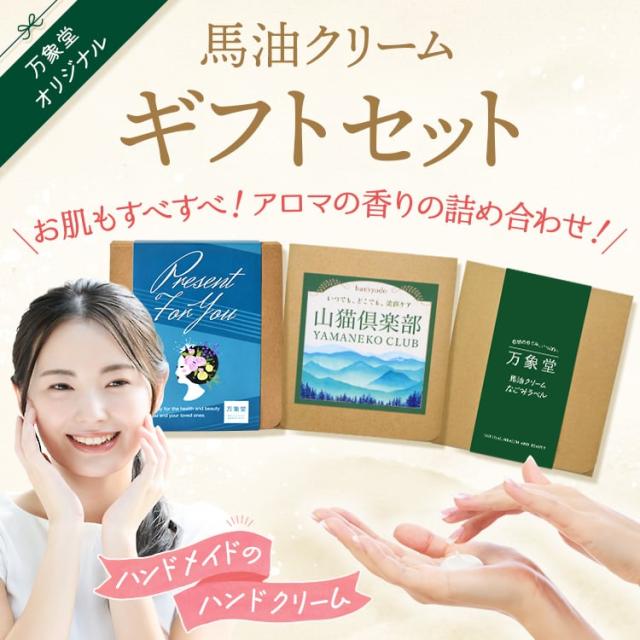 万象堂の人気の馬油クリームです。熊本阿蘇の工房で手つくりしました。自然の原料を基本に精油を配合しました。自然由来のアロマの香りでお肌も気分も癒されます。ラベンダー、バラ、レモングラス、ティーツリー、などいろいろなアロマの香りの詰め合わせ!プレゼントに最適です。母の日、お誕生日の贈り物にもおすすめします。乾燥肌、敏感肌でお悩みの方、ぜひお試しください!アロマの配合はすべて万象堂のオリジナルレシピで製造しています。