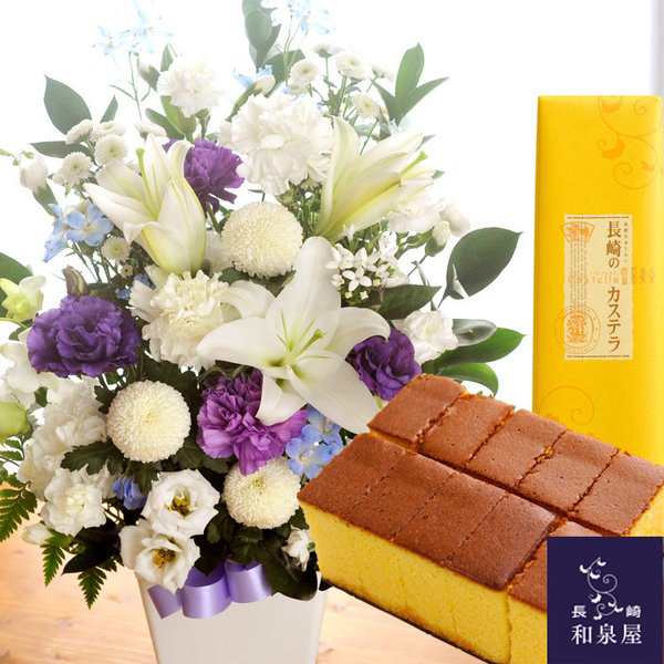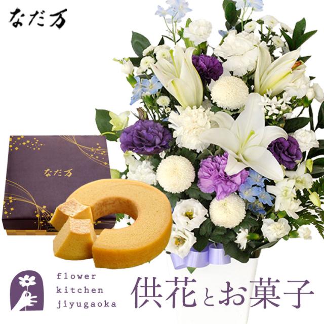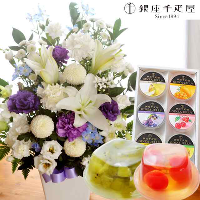 お供え花とスイーツのセット 洋花を使った ユリのお供えアレンジMサイズ +【銀座千疋屋】 銀座フルーツクーヘン8個入りセット 即日発送