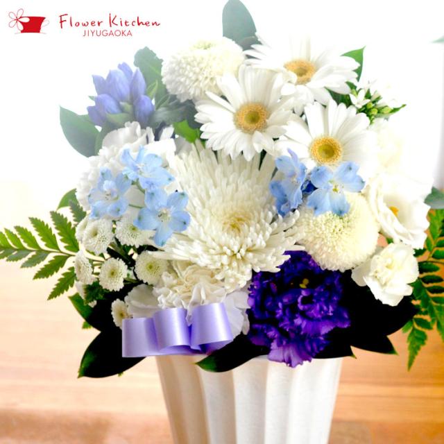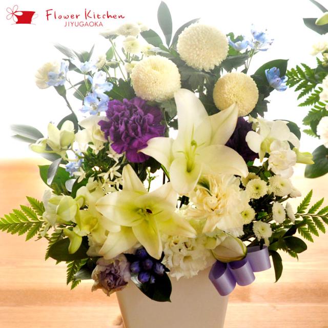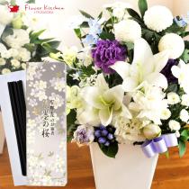 お供え 花 ユリのお供えアレンジ+宇野千代「淡墨の桜」お線香 お花 線香 百合 ゆり お悔やみ お悔み 仏花 生花 法事 命日 メッセージカ