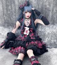 一部即納 パンク カジュアルロリータ ビスチェ +スカート チェック柄 ビビットカラー リボン ミニ丈 ショート丈 膝上 ノースリーブ レー