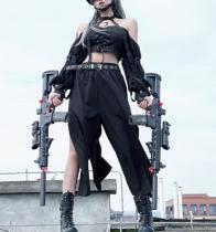 ロリータファッション ゴスロリファッション ゴスロリ パンク カジュアルロリータ パンツ ボトムス +ブラウス 2点セット 無地 ギャザー