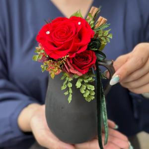 生花を器に生けており、花瓶のご用意なく香りやフレッシュさを楽しんでいただけます。お誕生日・ご結婚・出産・退職・引っ越しなど様々なお祝い事に。手で持ち運べるサイズ〜存在感のあるサイズまでご用意しております。