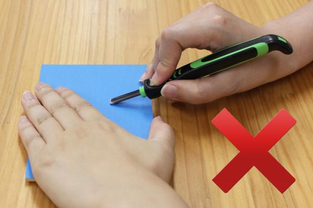 あくまで補助的な機能です。彫る方向に手を置かない、正しい持ち方で使用する。刃物を扱っているという認識を持って安全に使用しましょう。
