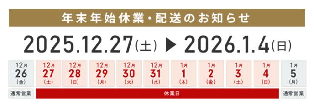 長期休業となる取引先メーカーもございますので、2025年内のご注文でもタイミングによっては【2026年1月5日(月)】以降のお手続きとなる場合がございます。
