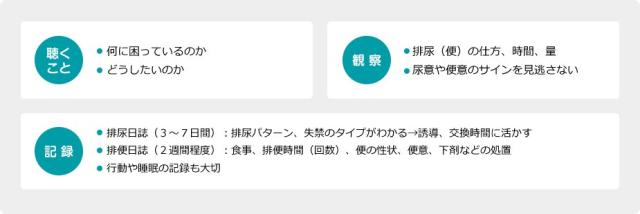 また、観察やコミュニケーションを通して情報収集を行い、排泄機能低下の要因をしっかりとアセスメントしましょう。十分なアセスメントが排泄ケアの質を向上させます。