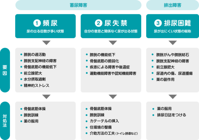 歳を重ねると、身体機能の衰えにより排尿プロセスを正しく行えず、排尿障害になることがあります。主な排尿障害は「頻尿」「尿失禁」「排尿困難」の3つです。「頻尿」「尿失禁」の2つは蓄尿障害に、「排尿困難」は排出障害に分類されます。それぞれの症状や要因、対処法を詳しく見ていきましょう。
