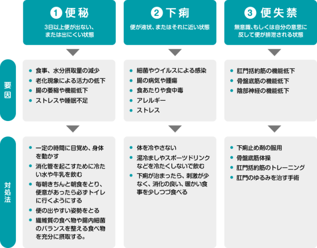 歳を重ねると、身体機能の衰えにより排便プロセスを正しく行えず、排便障害になることがあります。主な排便障害は「便秘」「下痢」「便失禁」の3つで、普段の生活習慣とも密接に関わってくる問題です。それぞれの症状や要因、対処法を詳しく見ていきましょう。