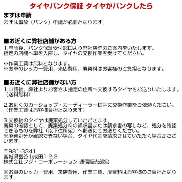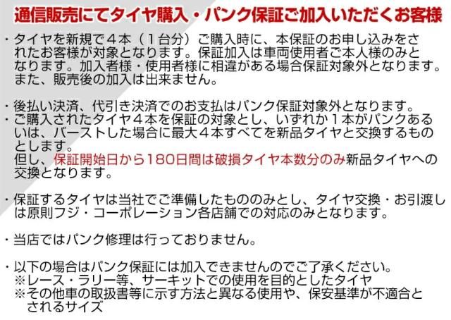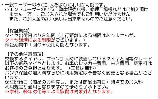 パンク保証サービスに加入をご希望の方は、カートから購入手続きに進んでいただき、その他ご要望欄に加入希望の旨をご入力ください。別途加入料金をご案内いたします。
