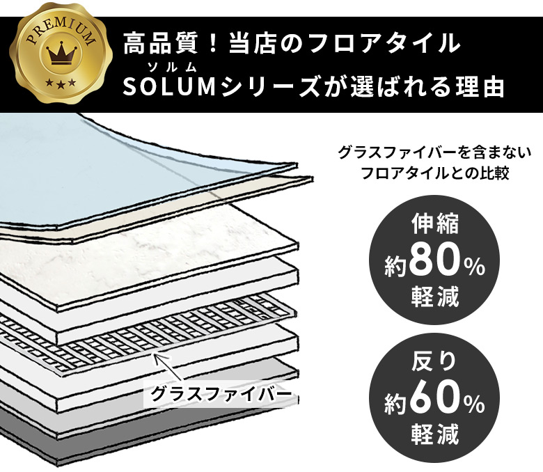 グラスファイバーなしのフロアタイルに比べて
