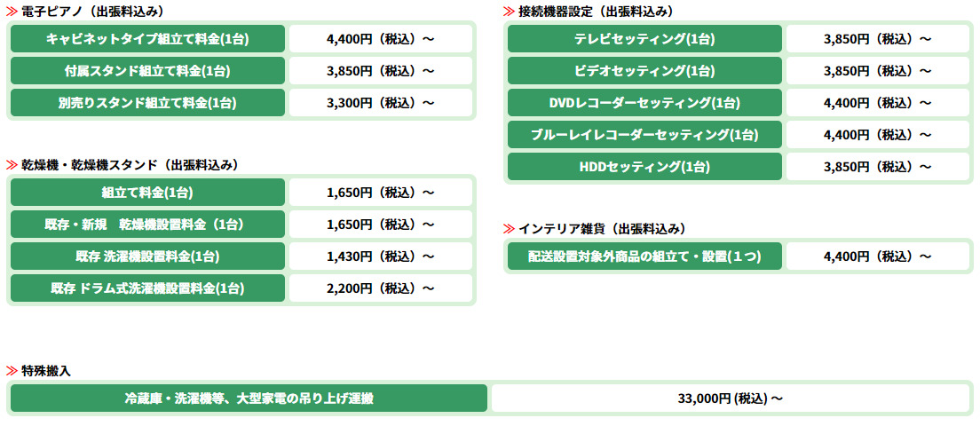 その他の設置料金一例・ 配送設置対象外商品につきましては、宅配便(佐川急便等)にて玄関先までのご配送を行っております。
