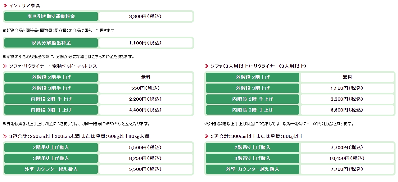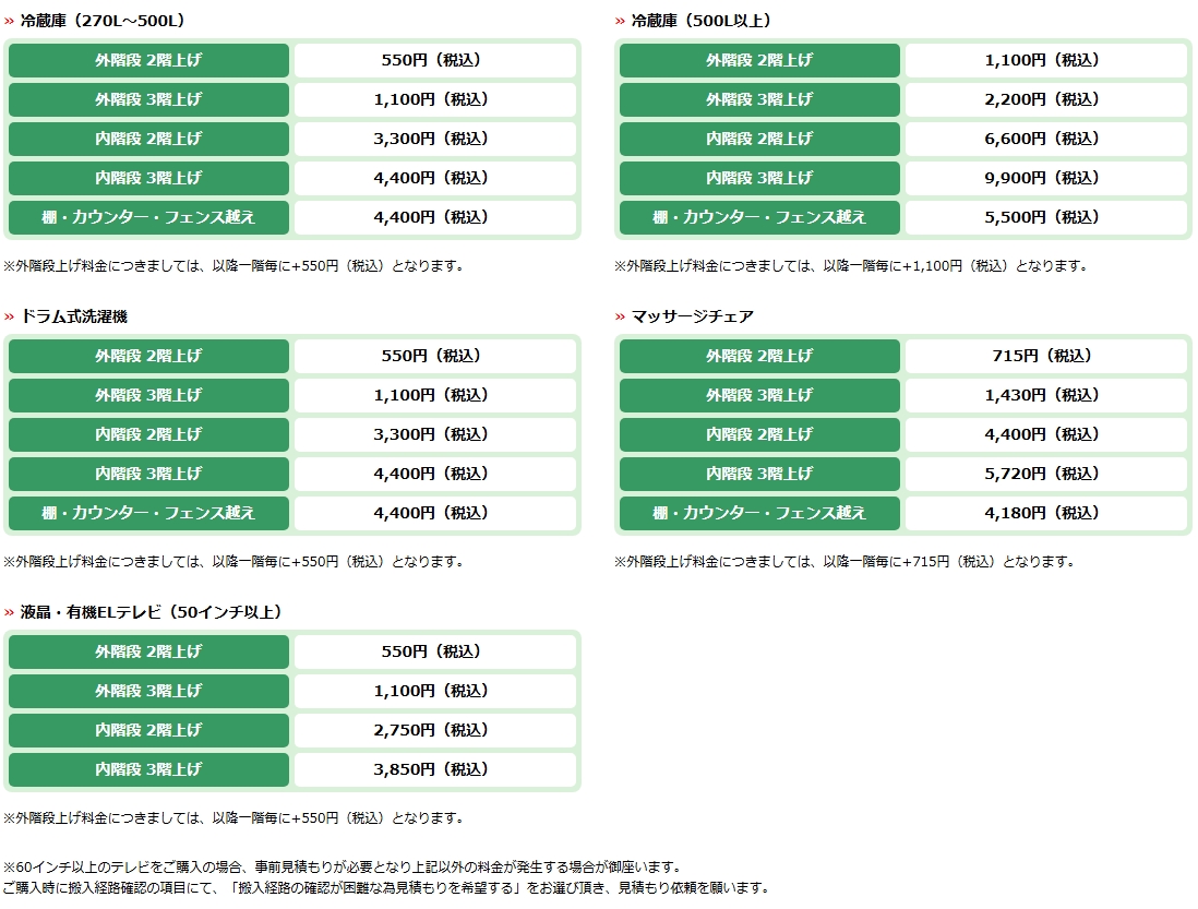 | [2]テレビ台・90L未満の冷蔵庫 ・2層式洗濯機 ・電子ピアノ・その他大型商品 | 1階・階上げ(エレベータ有):2,750円(税込) |