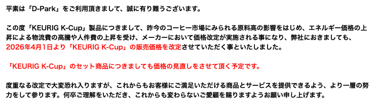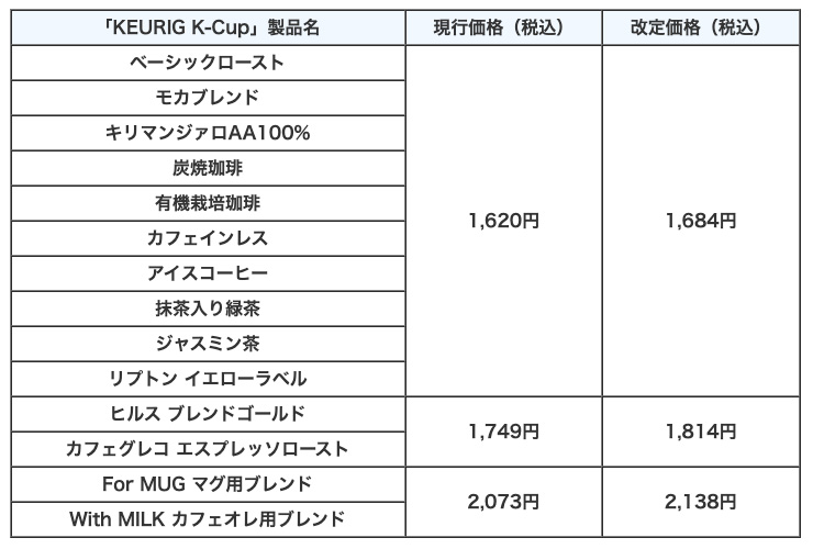 「KEURIG K-Cup」2026年4月1日からの当店販売価格(価格は税込表記)