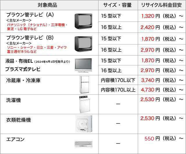 ※ 上記リサイクル料金は大手家電メーカーの公表料金です。