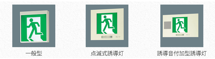 一般的な客席誘導灯と階段通路誘導灯は、常に点灯のみしている誘導灯で音声などによる誘導機能はありませんが、避難口誘導灯と通路誘導灯の誘導方式は、一般型と点滅式誘導灯、誘導音付加型誘導灯の種類があります。