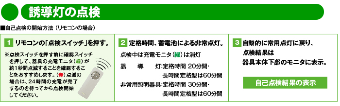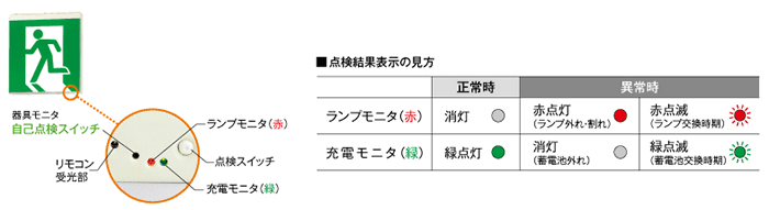 自己点検機能により、ワンタッチで自動的に定格時間の非常点灯を行い、ランプ・蓄電池(バッテリー)の状況を自動点検し、結果が確認できます。