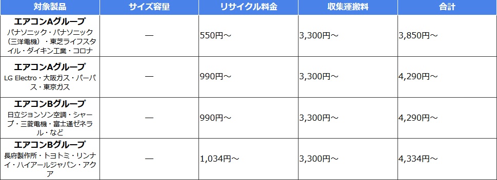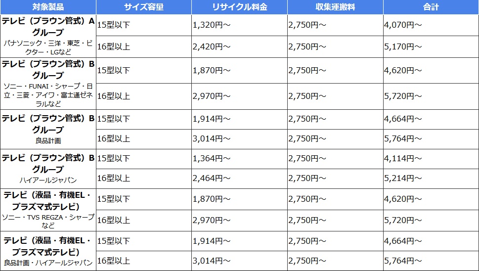 対象となる家電「テレビ・冷蔵庫・冷凍庫・洗濯機・衣類乾燥機・エアコン」とリサイクル料金は、下記の通りです。
