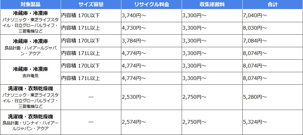 ・製造メーカー別のリサイクル料金は(財)家電製品協会 家電リサイクル券センター 再商品化等料金一覧( https://www.rkc.aeha.or.jp/recycle_price_compact.html )をご確認ください。