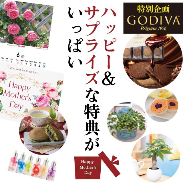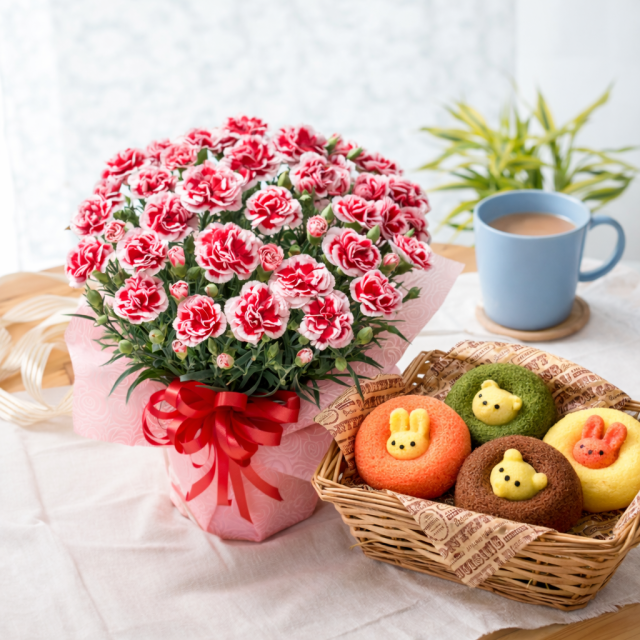 カーネーションと選べる3つの特典「観葉植物パキラ」「夏みかんマドレーヌ」「抹茶どら焼き」