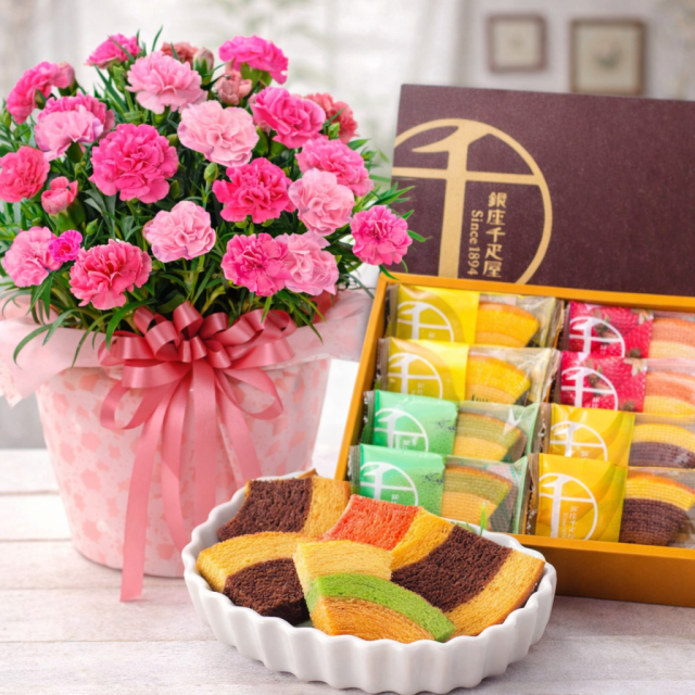 母の日 花とセット 銀座千疋屋フルーツバウムクーヘンと カーネーション さくらもなか 花とスイーツ プレゼント お菓子付き 60代 70代 80