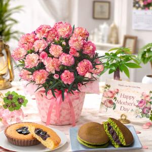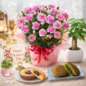 母の日 早割 プレゼント 2026 花とセット ギフト カーネーション ティーパーティ 鉢植え 選べる特典付き パキラ 抹茶どら焼き ブルーベリ