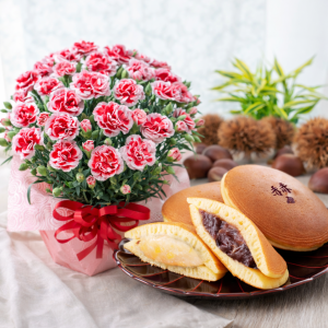 母の日 花とセット 生どら焼き「赫々」と カーネーション さくらもなか 花とスイーツ プレゼント お菓子付き 60代 70代 80代 のお母さん