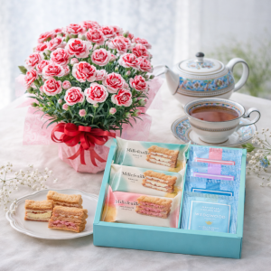 母の日 花とセット ミルフィーユとウエッジウッドティーセットと カーネーション さくらもなか 花とスイーツ プレゼント お菓子付き 60代