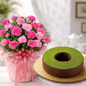 母の日 花とセット 宇治抹茶バウムクーヘンと カーネーション さくらもなか 花とスイーツ プレゼント お菓子付き 60代 70代 80代 のお母
