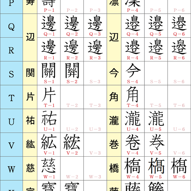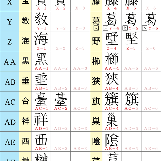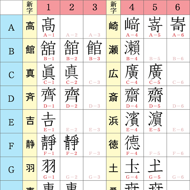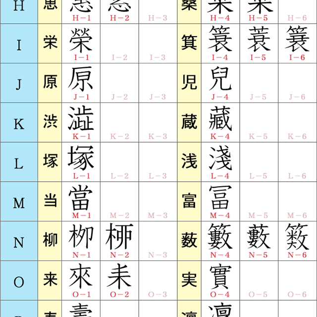 または、以下の表の該当文字と番号をお知らせ頂いても作製可能です。