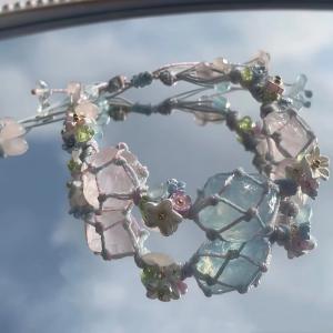 金属アレルギー対応 パワーストーン ブレスレット 春夏 肌映え 春コーデ お花見 天然蛍石 網袋編み ハンドメイド 花蝶モチーフ 2 連タイ
