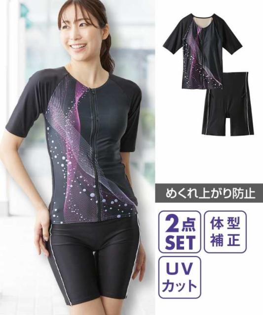 水着 レディース キャップ付 半袖 フィットネス 3点セット ブラック/杢チャコール/杢ブルー S/M ニッセン