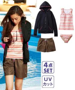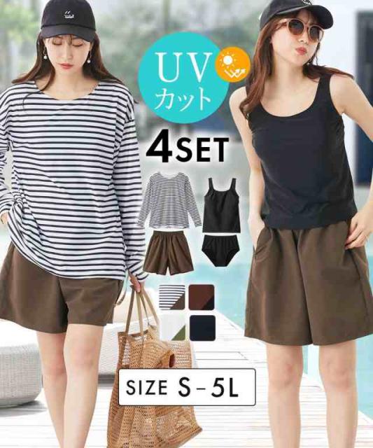水着 レディース ラッシュガード付 ボーダー タンキニ 4点セット ブラック/ホワイト S/M ニッセン