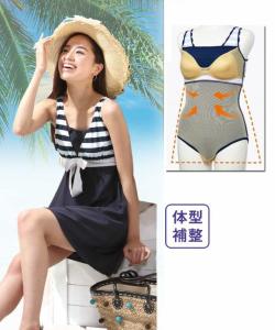 水着 レディース ボディ補整 ワンピース ネイビーボーダー/ブラックドット S/M ニッセン nissen