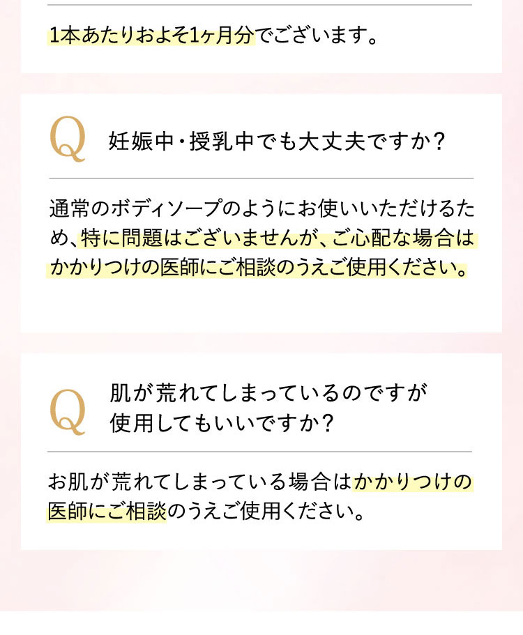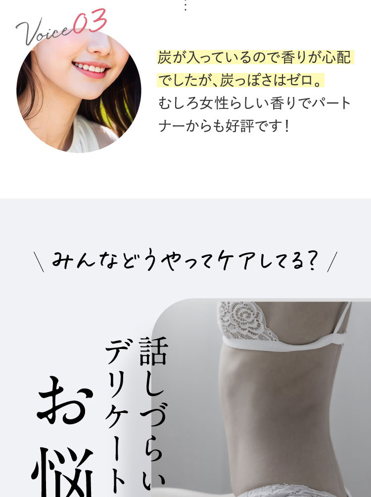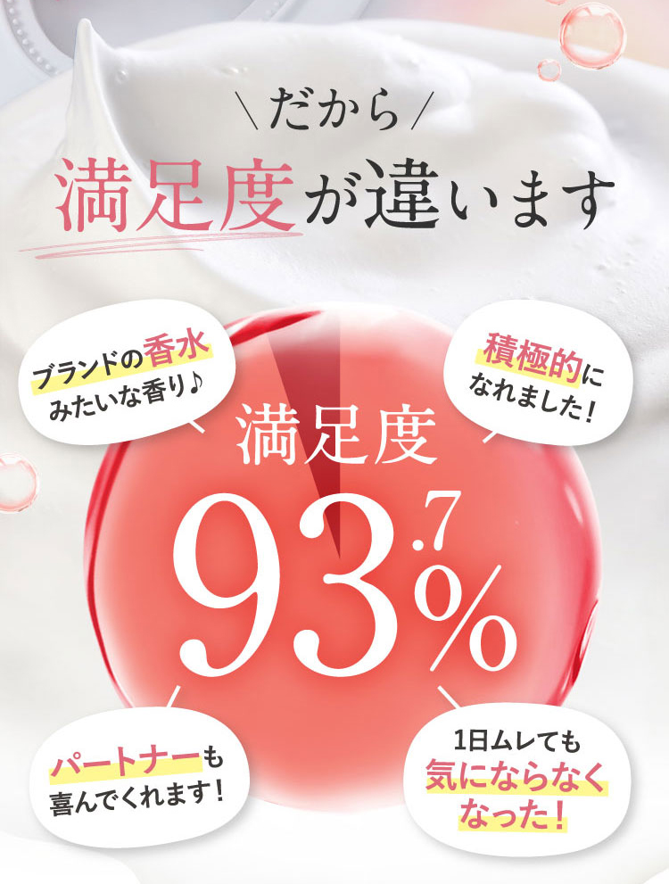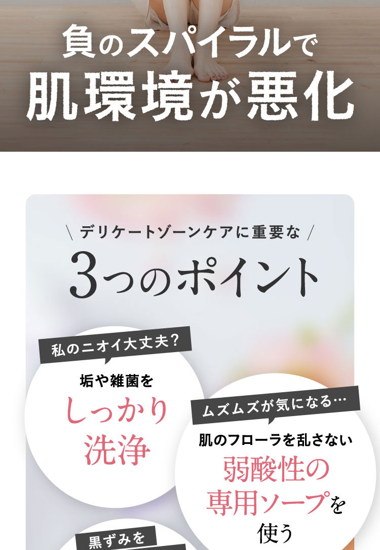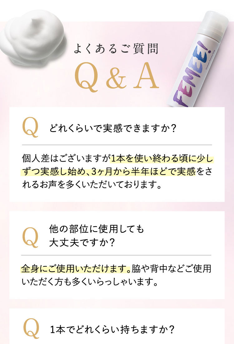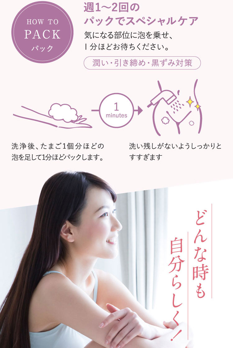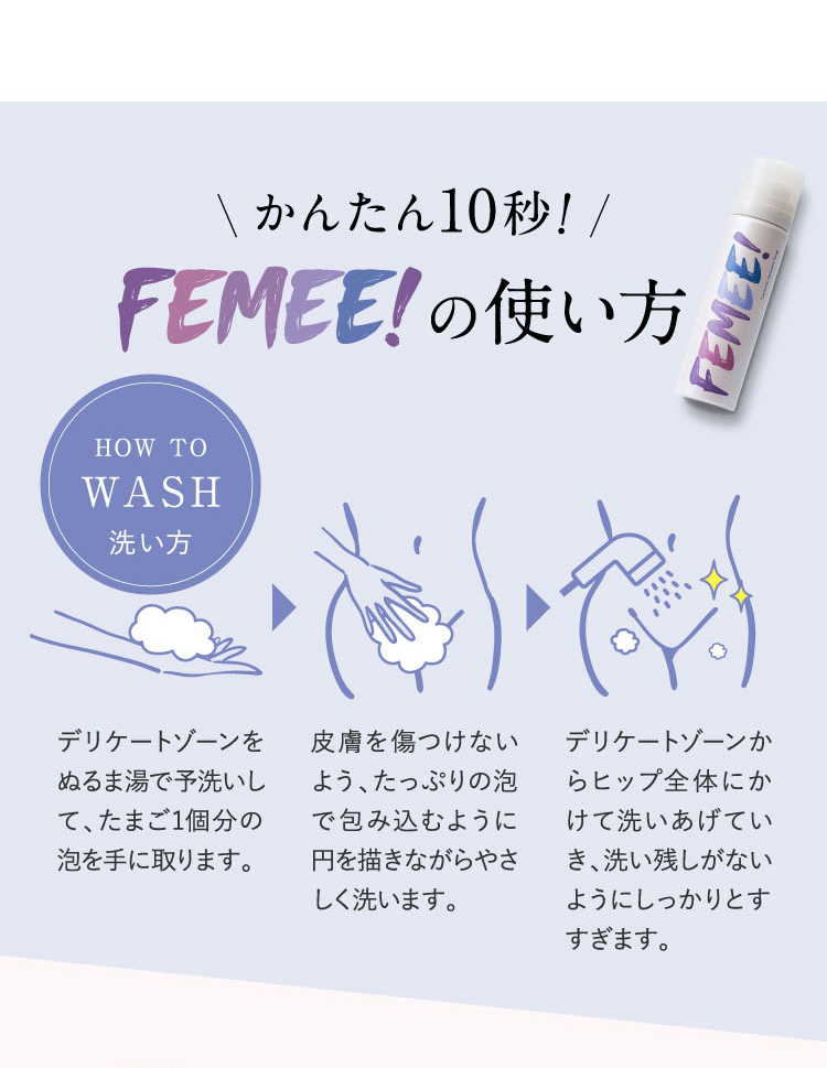 | 1.ぬるま湯でしっかり予洗いしてください。 2.缶を上下によく振り、容器を立てたまま適量(たまご1個分程度)を手のひらに取ります。 3.気になる部位(デリケートゾーン・ワキ等)にムラなく塗布し、泡でやさしくマッサージするようによく洗い、しっかりすすいでください。 |