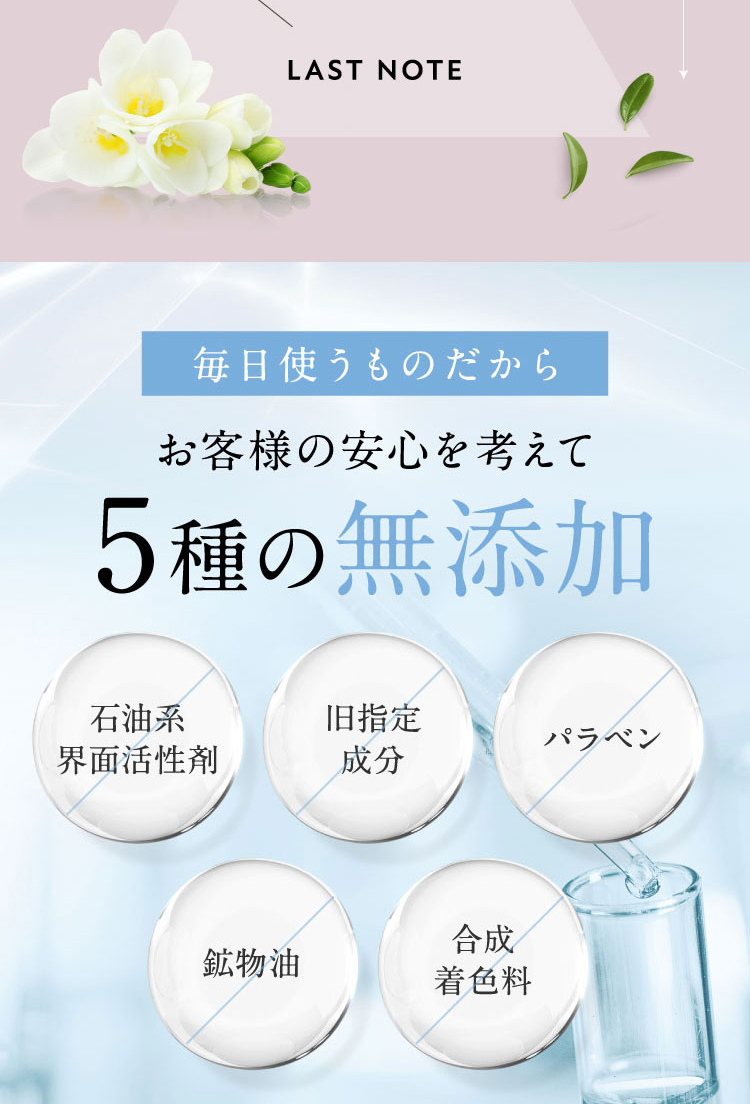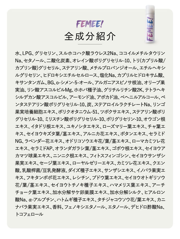 | 水、LPG、グリセリン、スルホコハク酸ラウレス2Na、ココイルメチルタウリンNa、セタノール、二酸化炭素、フェノキシエタノール、オレイン酸ポリグリセリル−10、トリ(カプリル酸/カプリン酸)グリセリル、ステアリン酸、メチルプロパンジオール、エチルヘキシルグリセリン、ヒドロキシエチルセルロース、塩化Na、カプリルヒドロキサム酸、キサンタンガム、BG、o−シメン−5−オール、アルガニアスピノサ核油、オリーブ果実油、リン酸アスコルビルMg、ホホバ種子油、グリチルリチン酸2K、テトラヘキシルデカン酸アスコルビル、アーモンド油、アボカド油、ベヘニルアルコール、エタノール、ペンタステアリン酸ポリグリセリル−10、炭、ステアロイルラクチレートNa、リンゴ果実培養細胞エキス、セラミドNP、カンゾウ根エキス、ポリクオタニウムー51、ツボクサエキス、ステアリン酸ポリグリセリル−10、ミリスチン酸ポリグリセリル−10、ポリグリセリン−10、オウゴン根エキス、イタドリ根エキス、ユキノシタエキス、ローズマリー葉エキス、チャ葉エキス、セイヨウキズタ葉/茎エキス、アルニカ花エキス、ボタンエキス、セラミドNG、ラベンダー花エキス、オドリコソウ花/葉/茎エキス、ローマカミツレ花エキス、セラミドAP、オランダガラシ葉/茎エキス、ゴボウ根エキス、セイヨウアカマツ球果エキス、ニンニク根エキス、フィトスフィンゴシン、セイヨウサンザシ果実エキス、セージ葉エキス、ローヤルゼリーエキス、カミツレ花エキス、デヒドロ酢酸Na、クエン酸、乳酸桿菌/豆乳発酵液、ダイズ種子エキス、サンザシエキス、ノイバラ果実エキス、フキタンポポ花エキス、レシチン、ブドウ葉エキス、セイヨウオトギリソウ花/葉/茎エキス、セイヨウトチノキ種子エキス、ハマメリス葉エキス、アーチチョーク葉エキス、加水分解サケ卵巣膜エキス、加水分解シルク、ヒアルロン酸Na、α−アルブチン、ハトムギ種子エキス、タチジャコウソウ花/葉エキス、カニナバラ果実エキス、香料、トコフェロール |