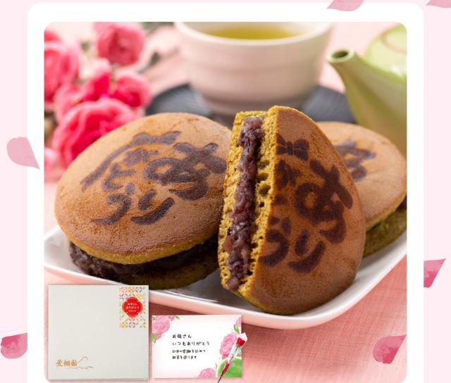 【早割:ポイント5%】母の日 2026 ギフト ありがとうどら焼き&静岡茶セット 母 祖母 人気 スイーツ 和菓子 ミニカーネーション メッセ