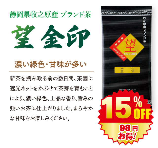 【大蔵ざらえセール対象:20%OFF】 極上望金印100g 静岡茶 ギフト 緑茶 お茶 静岡県牧之原ブランド茶 高級 被覆茶 被せ 日本茶 静岡茶