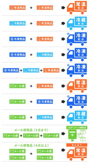 温度帯の異なる商品を同時にご注文いただきました場合、お客様になるべく少ない負担にて商品をお受け取り頂けますよう、温度帯が異なる場合も下記の通り、原則同梱にて発送をさせて頂いております。