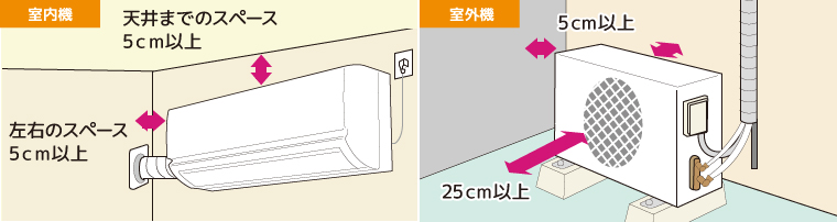 室内機の設置については、室内機上面から天井までに、最低5cm以上の余裕が必要です。
