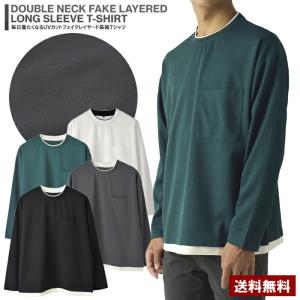 メンズ ダブルネック クルーネック フェイクレイヤード 長袖Tシャツ 梨地 UVカット ストレッチ ドライ ユニセックス イージーケア ワイド