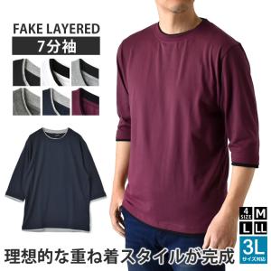 レイヤード風 7分袖 Tシャツ メンズ フェイクレイヤード 重ね着風 カットソー 無地 クルーネック 柔らか 綿混 ストレッチ 春 夏 秋 M L L