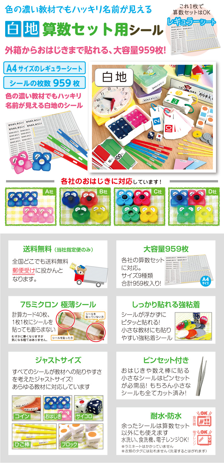 算数セット用お名前シール 【白地】 ピンセット付き シンプルデザイン / お名前シール 名前シール おなまえ 名前 ネーム シール 算数 さ