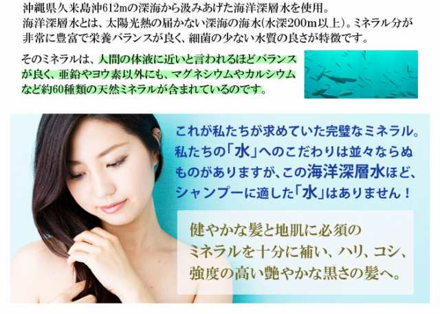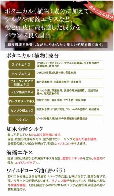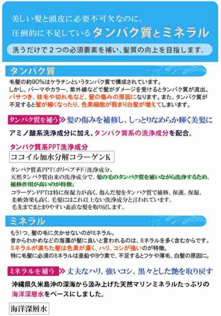 水(海洋深層水由来)・オレフィン(C14−16)スルホン酸Na・ラウロイルメチルアラニンNa・ココイルグルタミン酸TEA・ラウラミドDEA・ココイル加水分解コラーゲンK・ヒアルロン酸ヒドロキシプロピルトリモニウム・ココイル加水分解ケラチンK・加水分解シルク・ベタイン・ニガリ・カルボキシメチルキチン・カンゾウ根エキス・トゲキリンサイ/ミツイシコンブ/ウスバアオノリエキス・スギナエキス・ホップエキス・セイヨウアカマツ球果エキス・レモン果実エキス・ローズマリー葉エキス・α−グルカンオリゴサッカリド・カニナバラ果実油・ポリクオタニウム−10・クオタニウム−51・BG・DPG・ラウレス−9・ペンチレングリコール・カプリリルグリコール・フェノキシエタノール